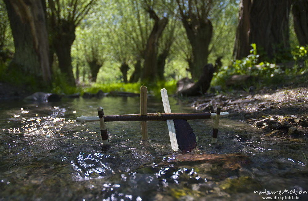 kleines Wasserrad aus Stöckchen und Eisstielen in einem Bac ...