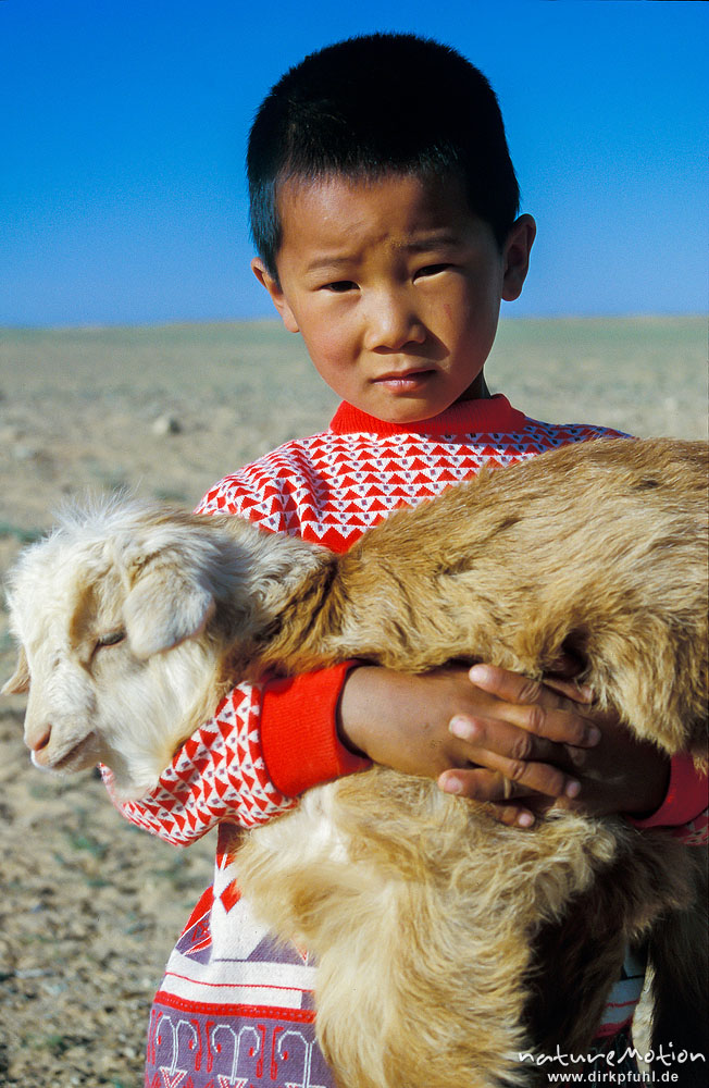 Junge hält junge Ziege im Arm, Wüste Gobi, Mongolei ...