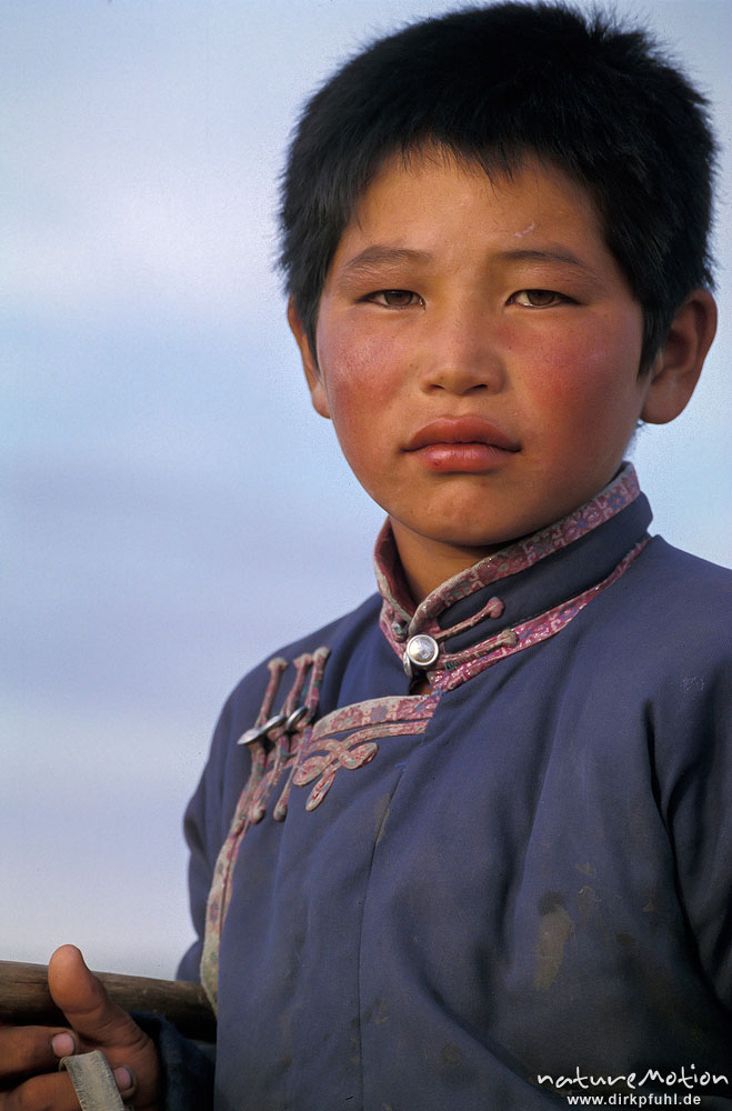 Junge, auf Pferd mit Urga, Blick ist Mischung aus Stolz und ...
