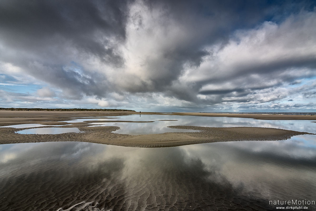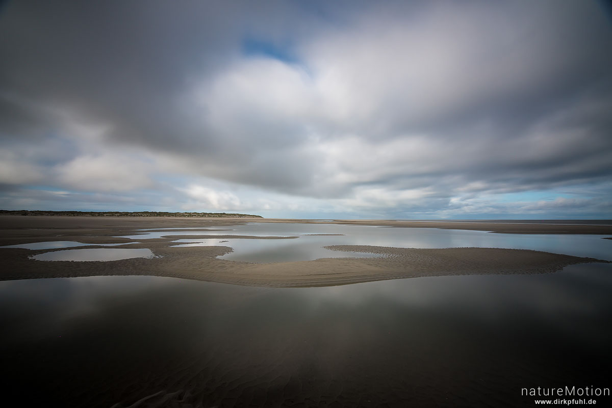 Strand mit Prielen, Wolken spiegeln sich im Wasser, lange be ...