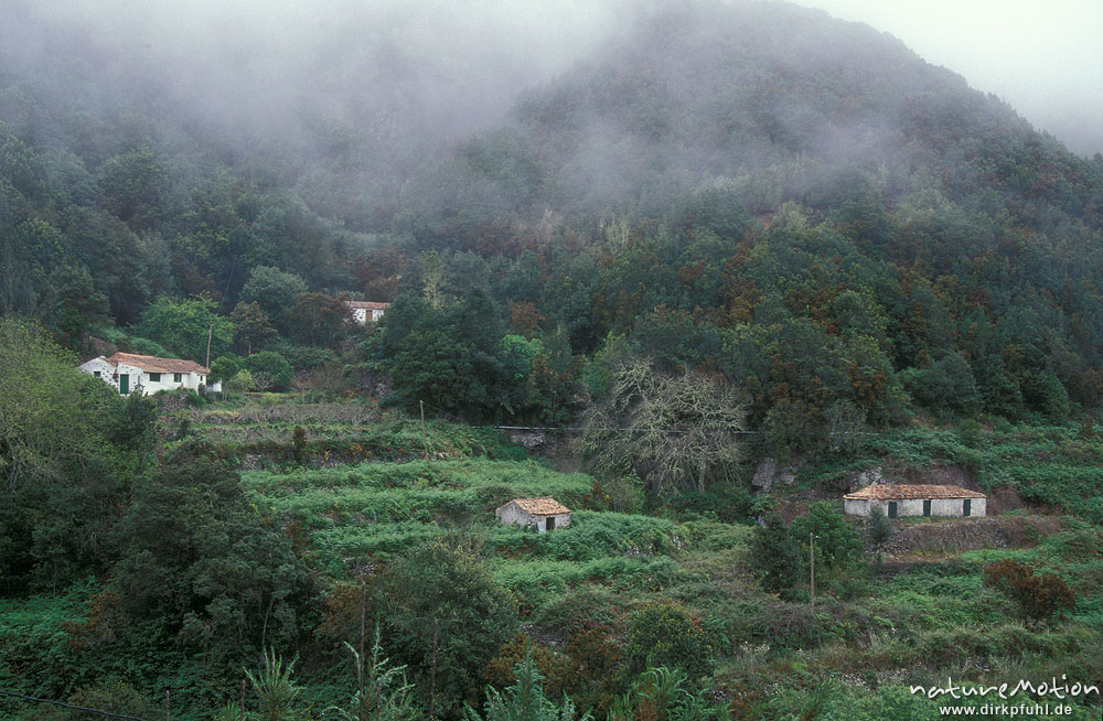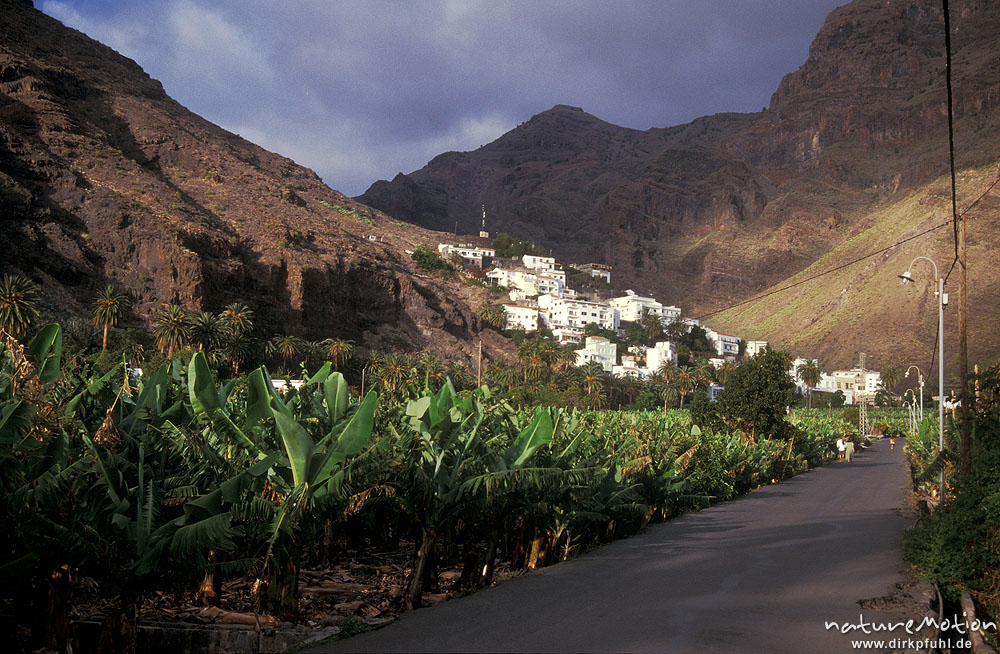 Häuser am Hang vor Bananen-Plantage, Calera, Valle Gran Rey ...