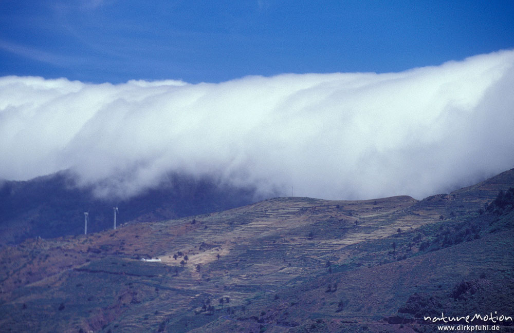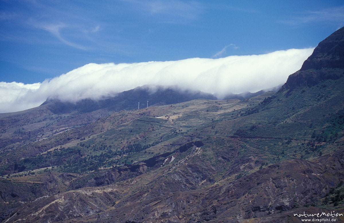 Passatwolken fließen einen Berghang hinab, Gomera, Spanien ...