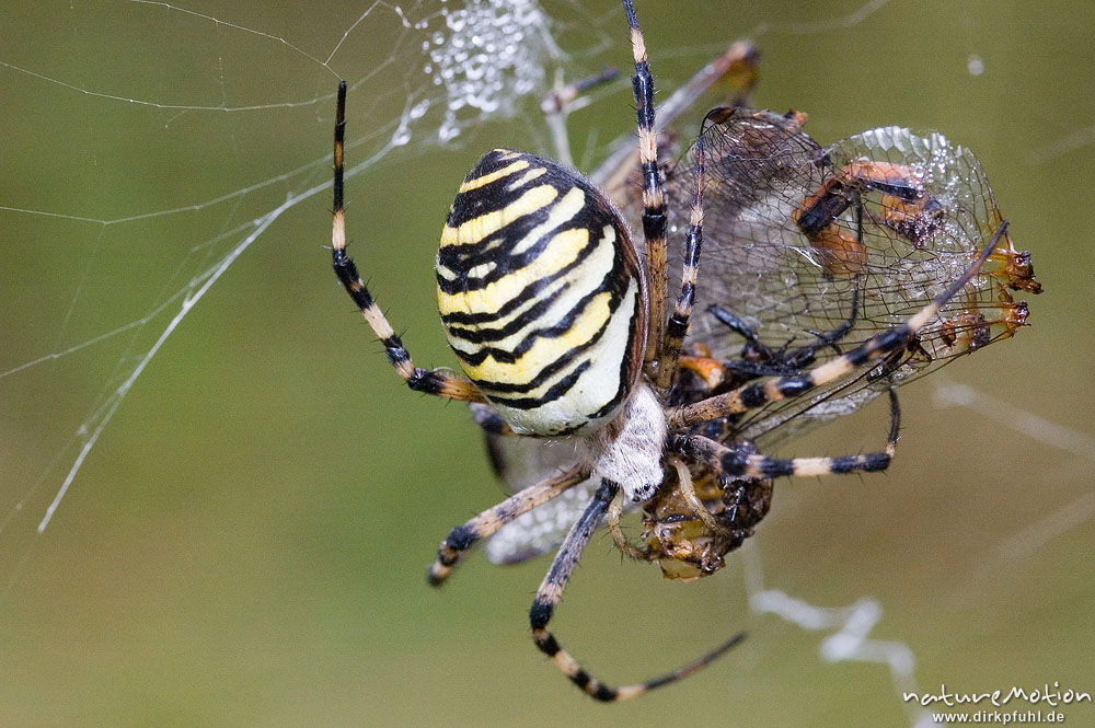 Wespenspinne, Argiope bruenechii, Araneidae, mit Beute im Ne ...