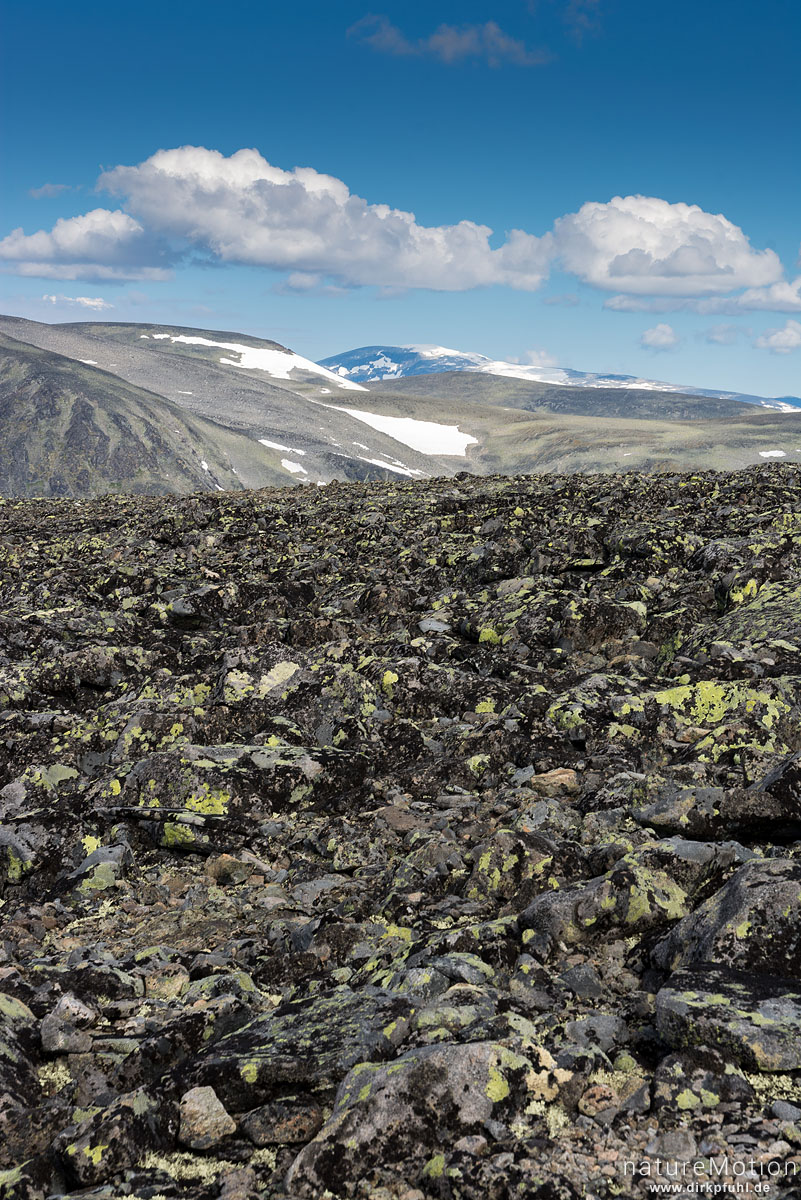 Geröllfeld, Höhenzüge mit Schneefledern, Veslfjellet, Jot ...