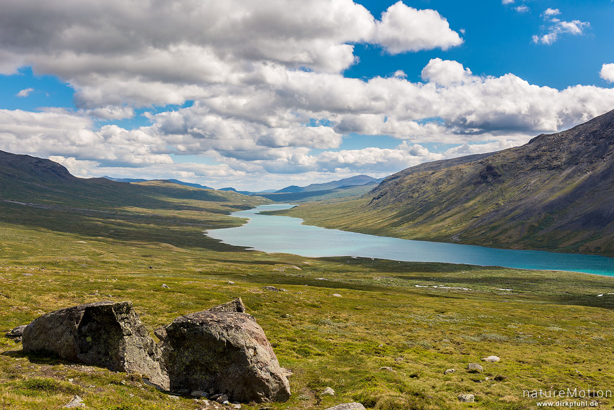 Berge unter Regenwolken, Blick zum See Russvatnet, Wanderweg ...
