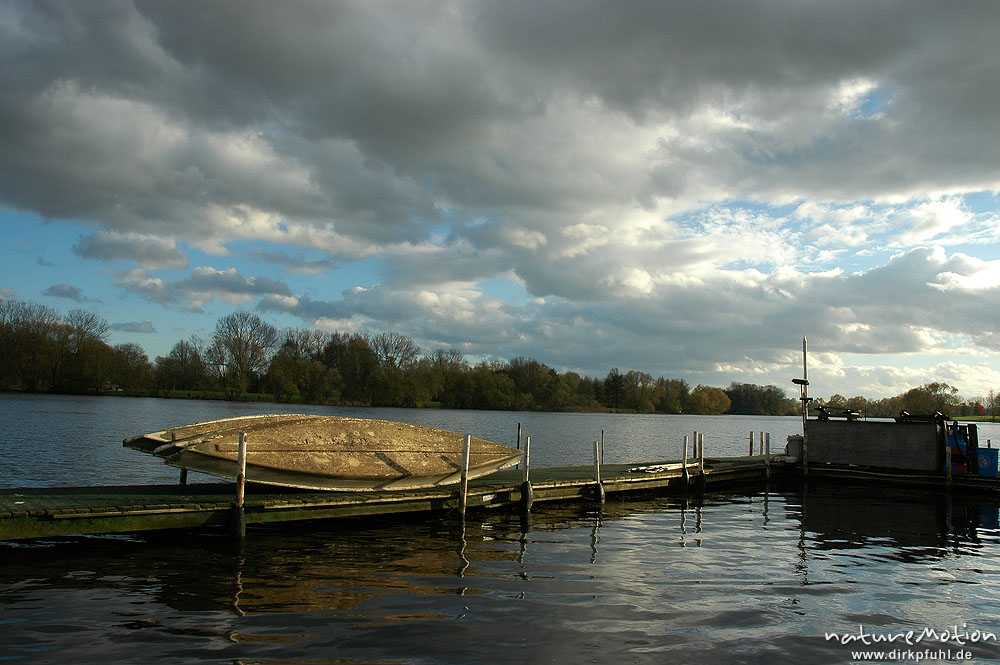 Bootssteg mit umgedrehtem Paddelboot, Herbsthimmel, Kiessee, ...