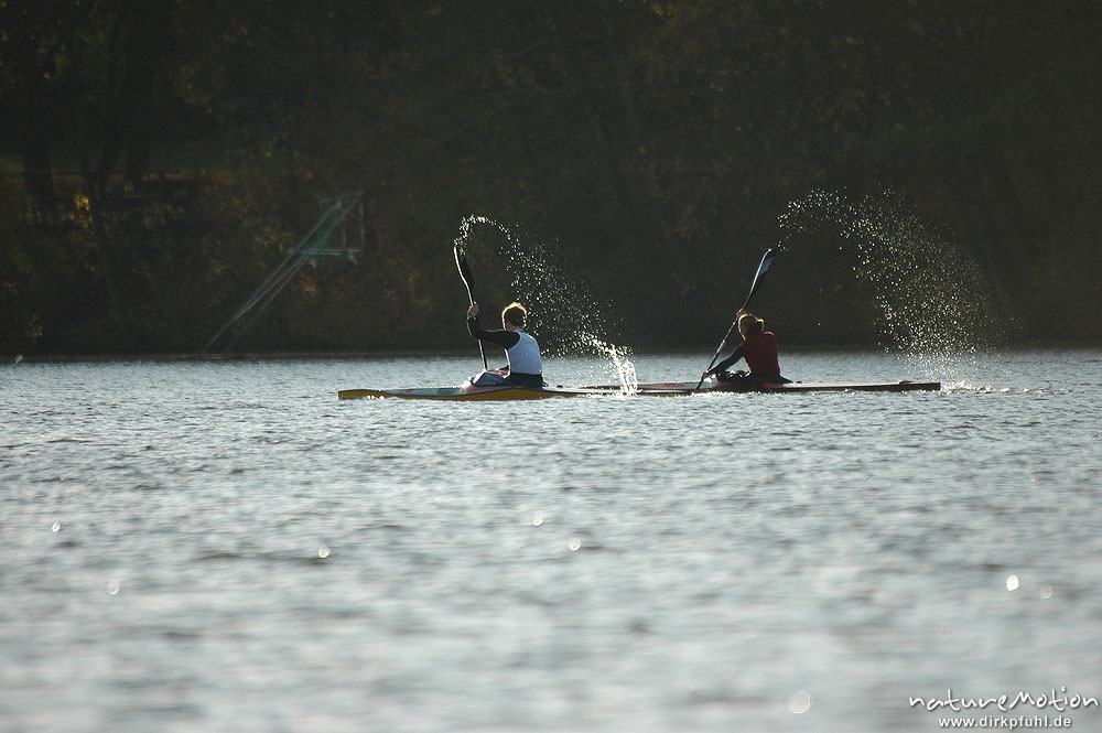 Kanuten, Paddelschlag mit Spritzwasser im Gegenlicht, Kiesse ...