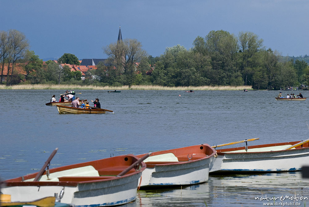 Ruderboote auf dem See, Häuser und Kirchturm von Bernshause ...