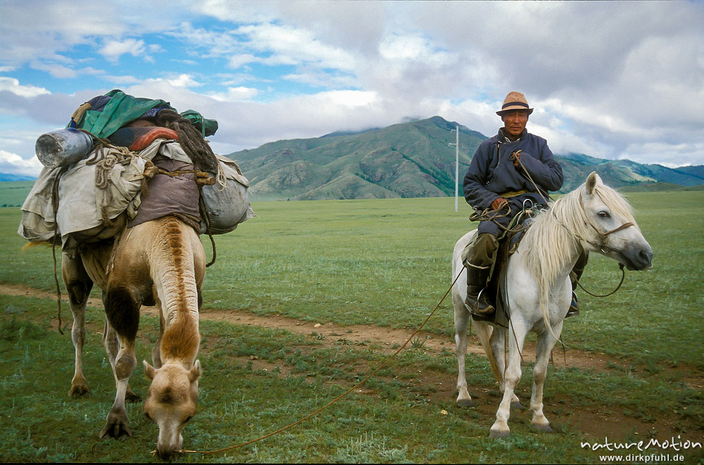 Nomade auf Pferd und Lastenkamel, auf Wanderschaft, Changai, ...