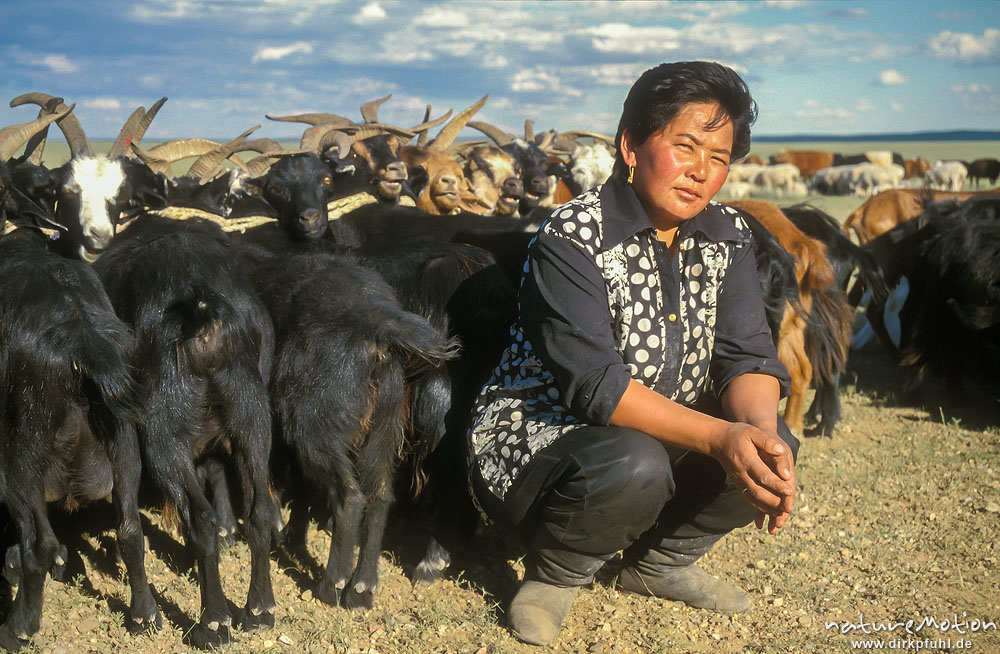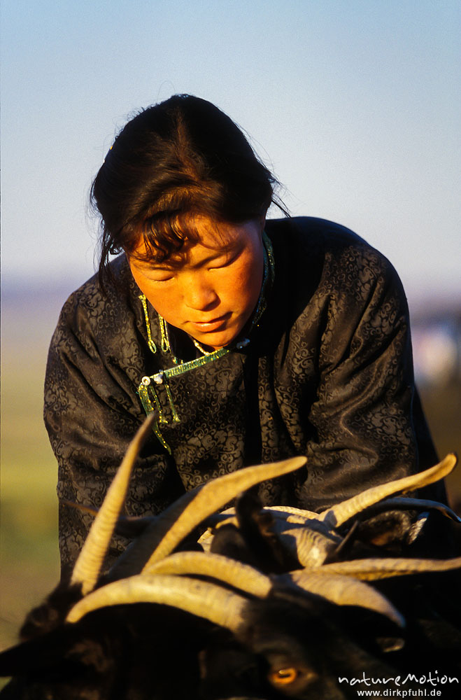 Mongolin vor ihren Ziegen, Wüste Gobi, Mongolei ...