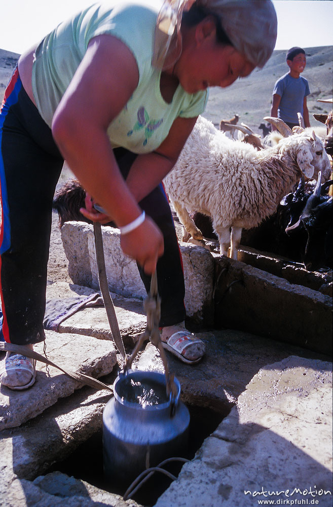 Frau am Ziehbrunnen, Tränken einer Ziegenherde, Wüste Gobi ...