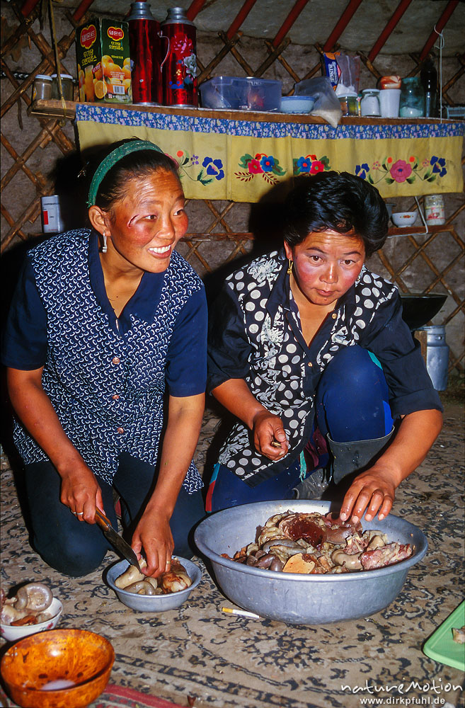 zwei Frauen bereiten das Fleisch eines frisch geschlachteten ...