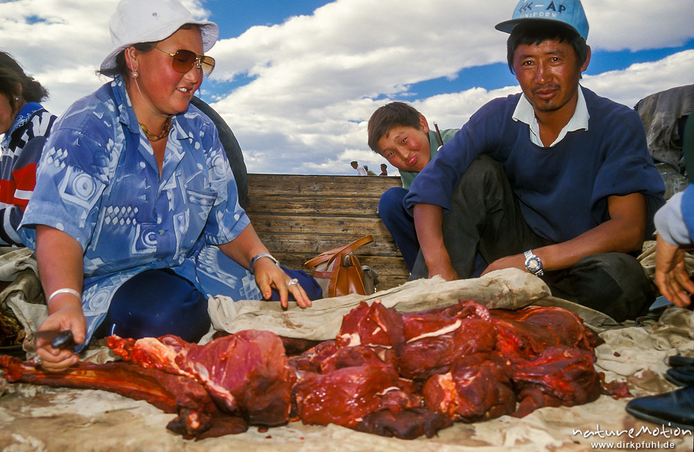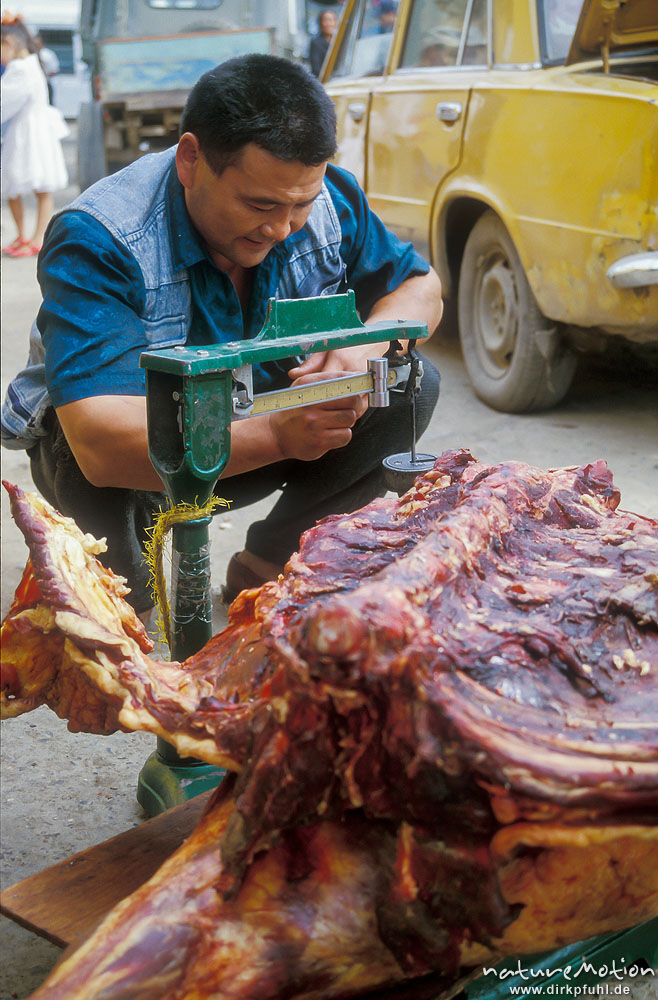 Abwiegen von Fleisch, Markt, Ulaanbaatar – Ulan Bator, ...