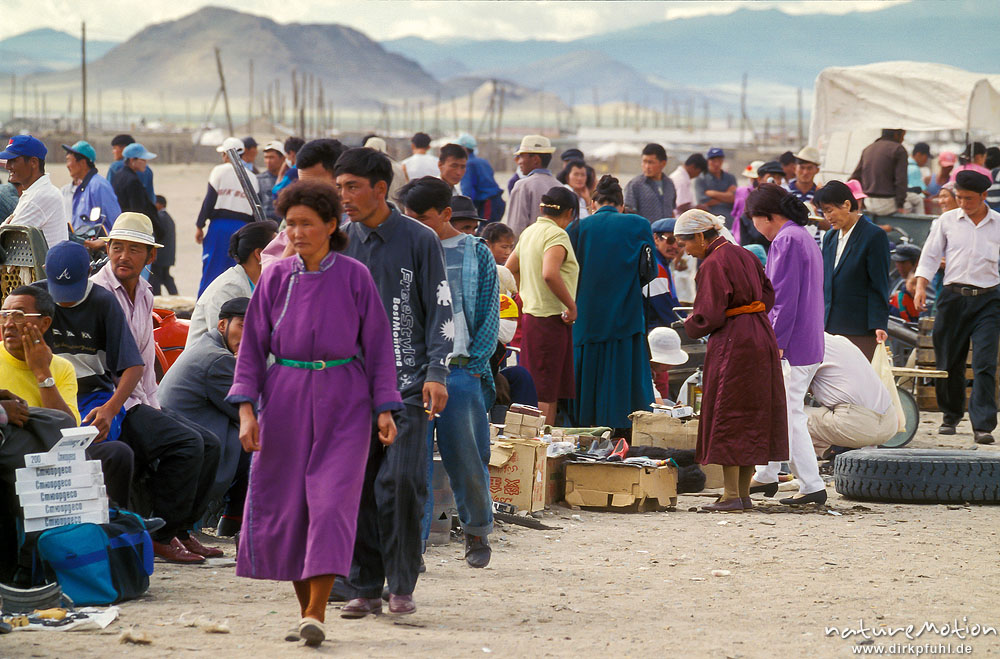 angebundene Pferde und wartender Junge, Markt von Chowd, Cho ...