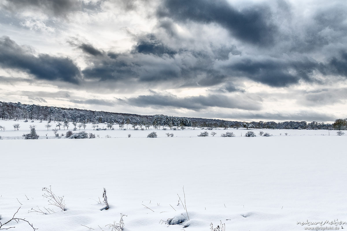 Wiese mit Baumreihen, tief verschneit, dunkle Wolken, Kerstl ...