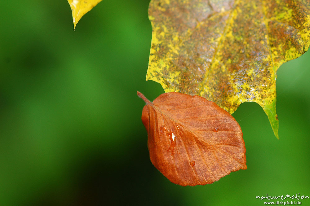 Buchenblatt klebt an Ahornblatt, Herbstfärbung, Göttinger ...