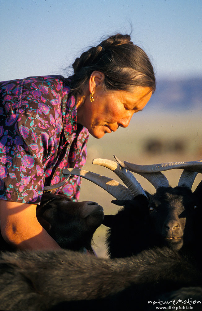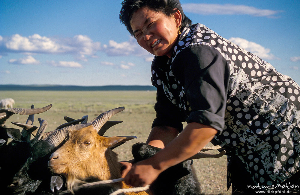 Frau zurrt Ziegen zum Melken zusammen, Wüste Gobi, Mongolei ...