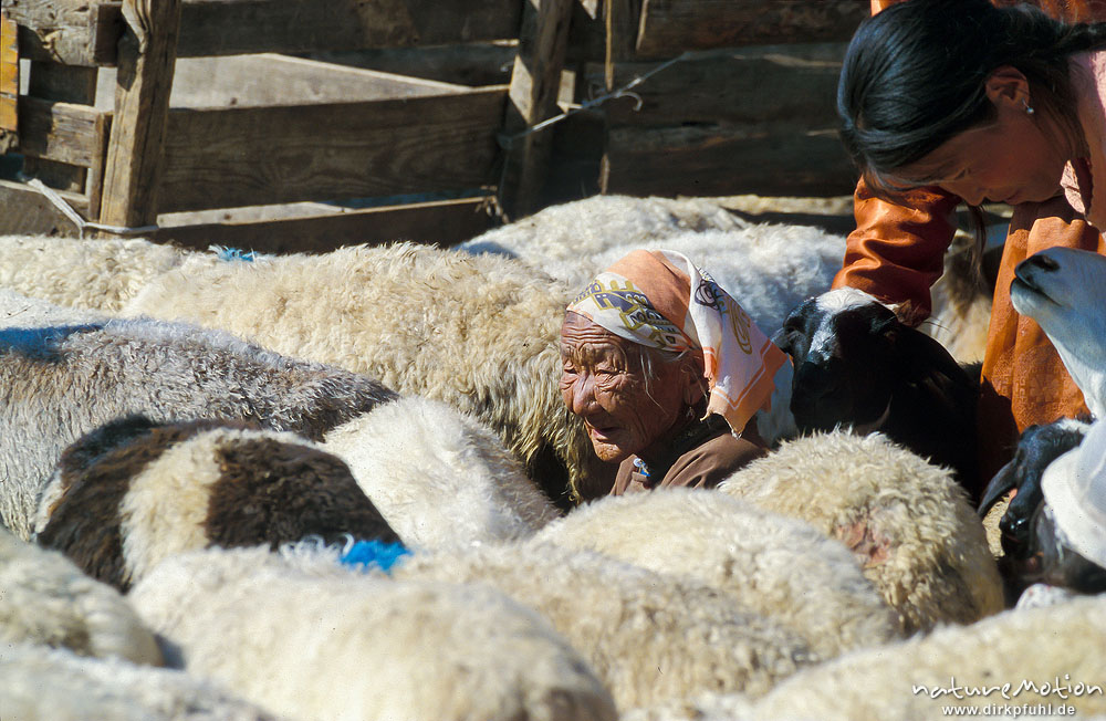alte Frau beim melken inmitten der Schafe, Changai, Mongolei ...