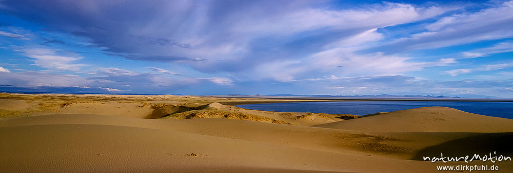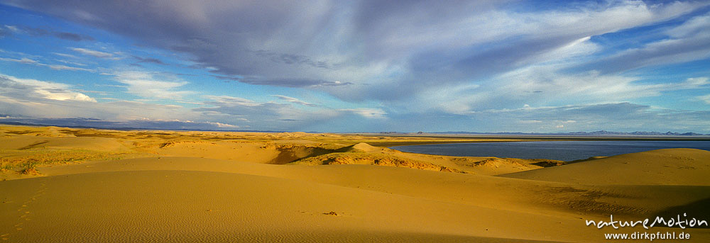 Sonnenuntergang, Dörgön Nuur und Sanddünen von Mongol Els ...