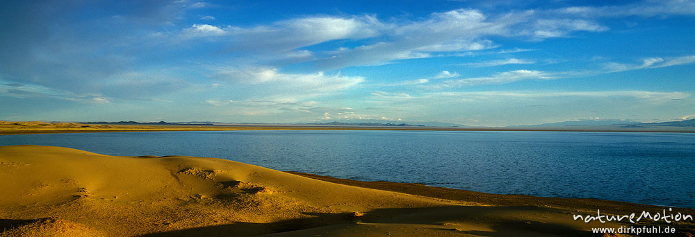 Sanddünen am Ufer des salzigen Dogon Nuur, Abendlicht, Mong ...