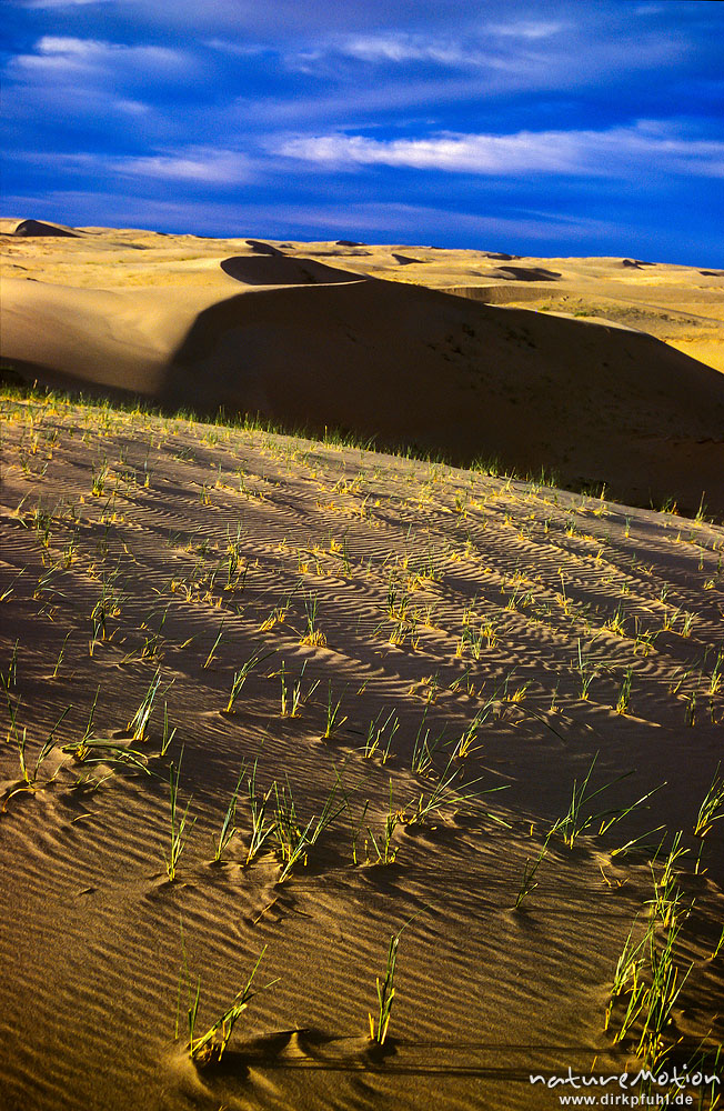 Dünen von Mongol Els im Abendlicht, schütterer Grasbewuchs ...