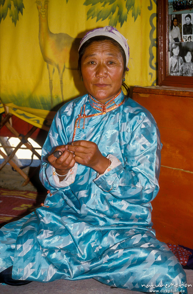 Frau in türkisfarbenem Deel beim Nähen eines Deels, Mongol ...