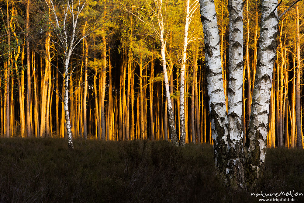 Birken vor Kiefernwald, Abendsonne, Heide bei Trebel, Wendla ...