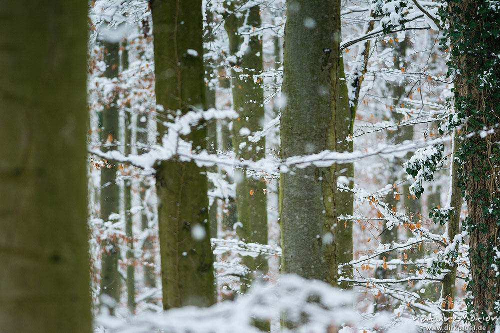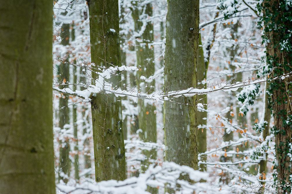 Schneefall im Buchenwald, Göttinger Wald, Kombination aus z ...