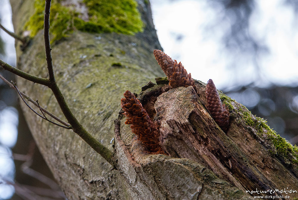 Fichtenzapfen, von Eichehäher in Astspalte geklemmt und lee ...