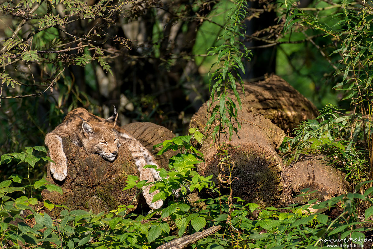 Luchs, Lynx lynx, Felidae, Tier sonnt sich auf einem Baumsta ...