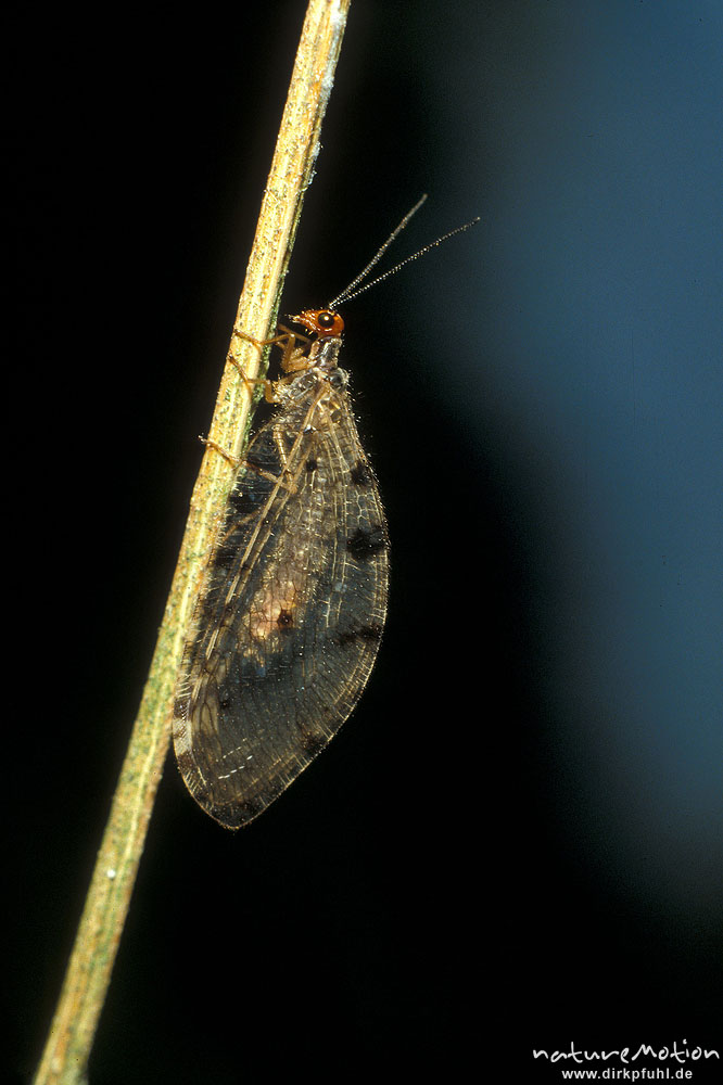 Bachhaft, Osmylus fulvicephalus, Osmylidae, auf Halm, Niemet ...