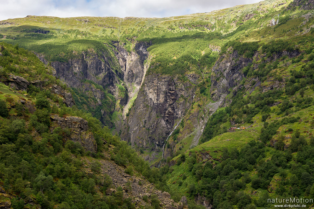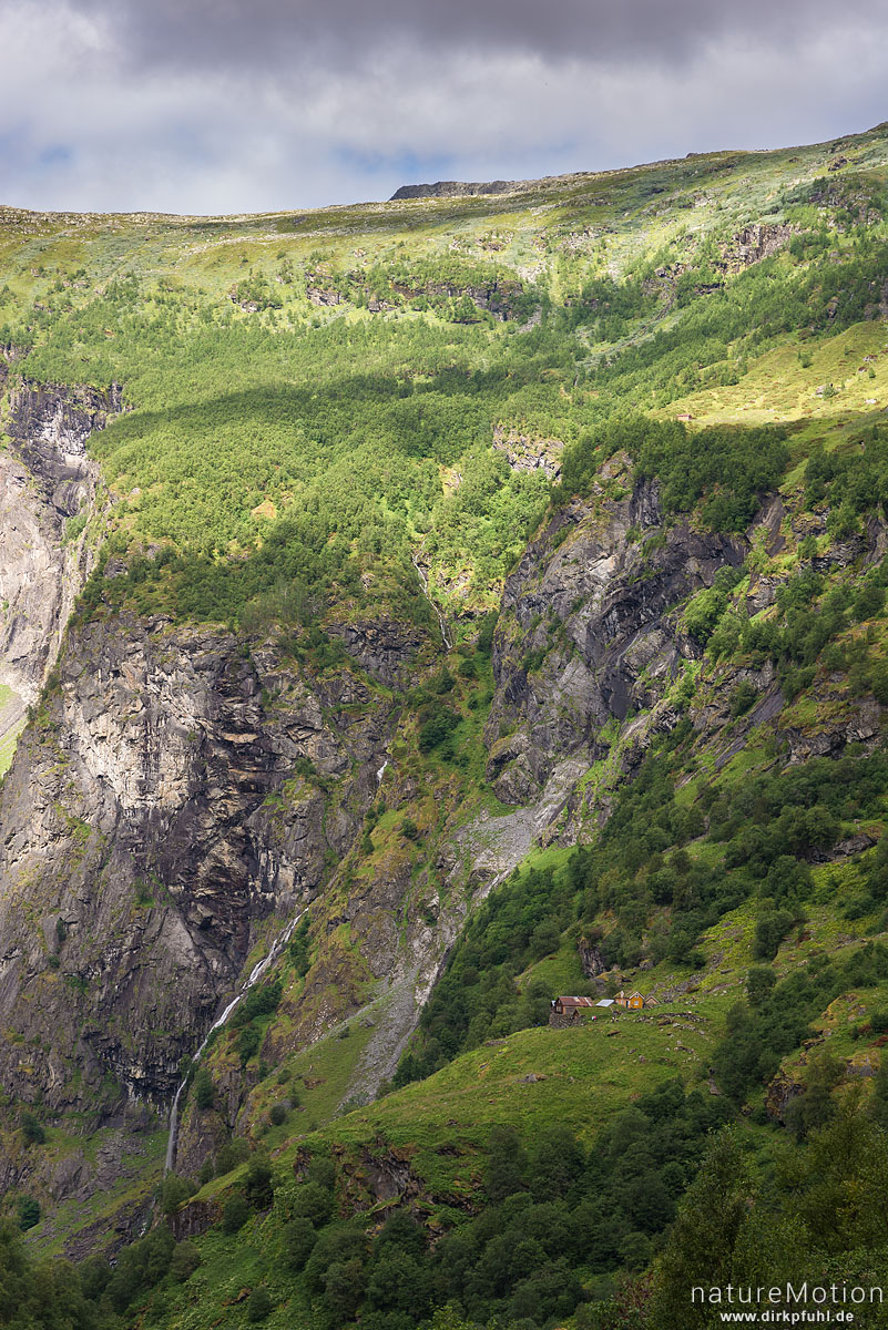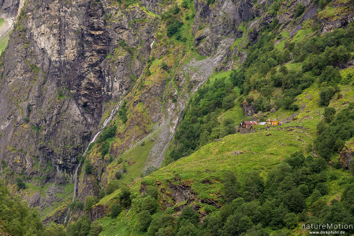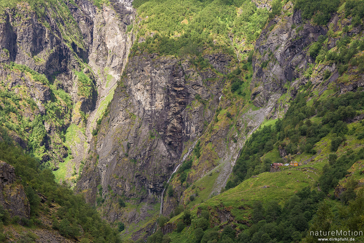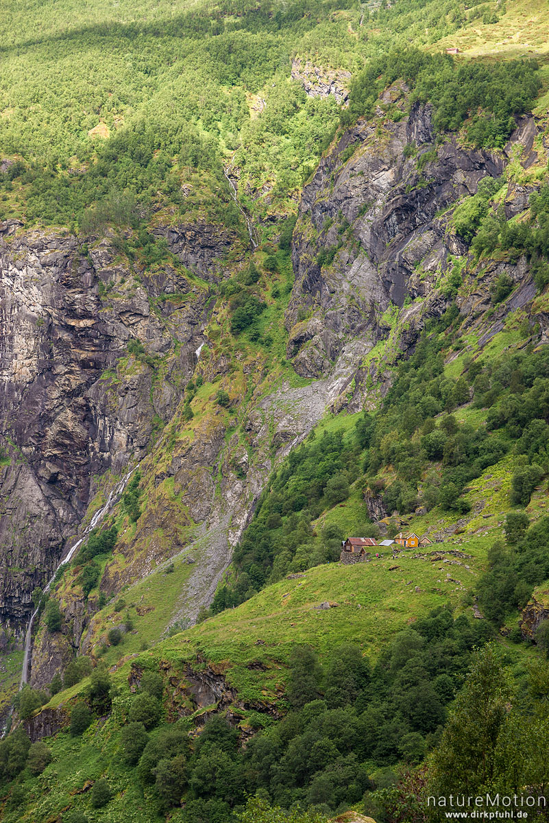 Almhütten inmitten steil abfallender Felswände, Flusslauf ...