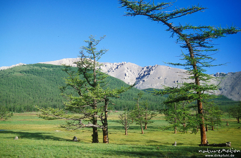 Lärchenwipfel am Seeufer, Chowsgöl Nuur, Mongolei ...