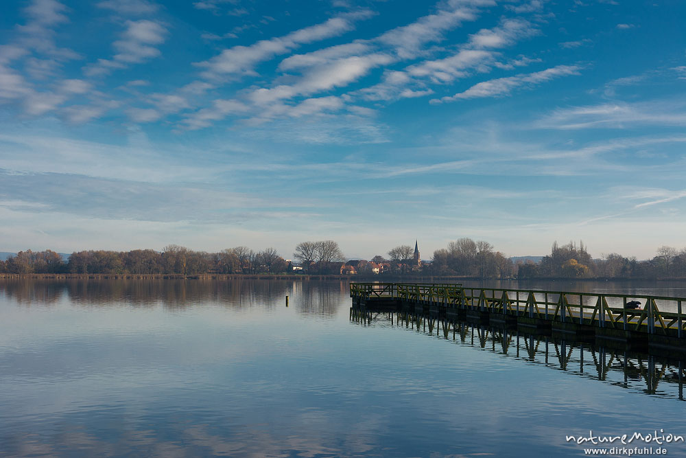 Steg und Blick auf Bernshausen, Morgenlicht, Seeburger See, ...