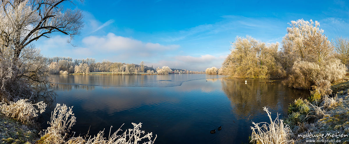 zugefrorener See, Bäume am Ufer mit Raureif bedeckt, Kiesse ...