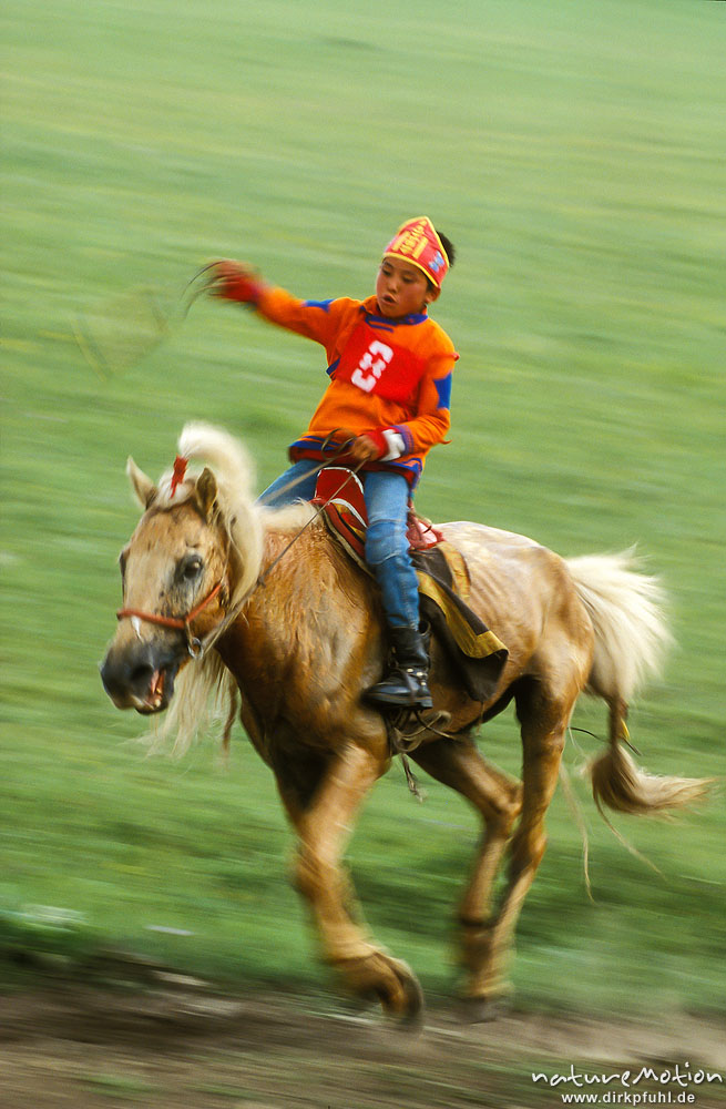 Zieleinlauf, Junge auf Pferd, , Mongolei ...