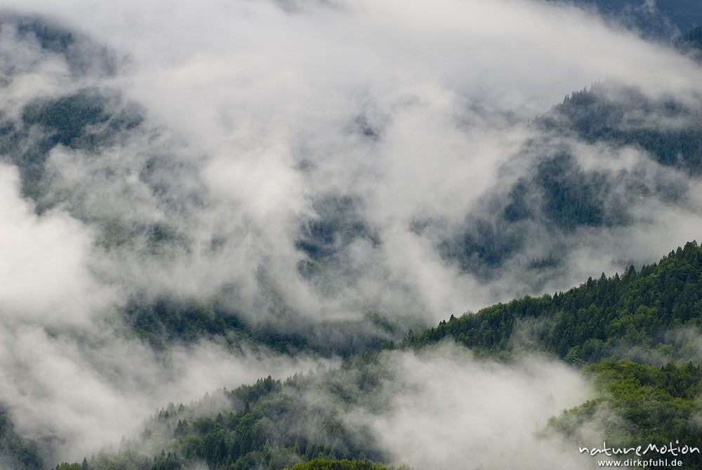 Regenwolken hängen im Bergwald, Berge am Bohinjer See, Bohi ...