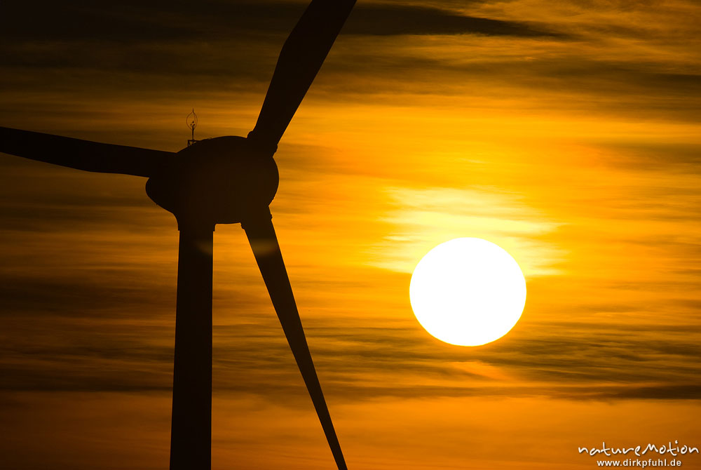 Windrad und untergehende Sonne, Sonnenscheibe inmitten orang ...