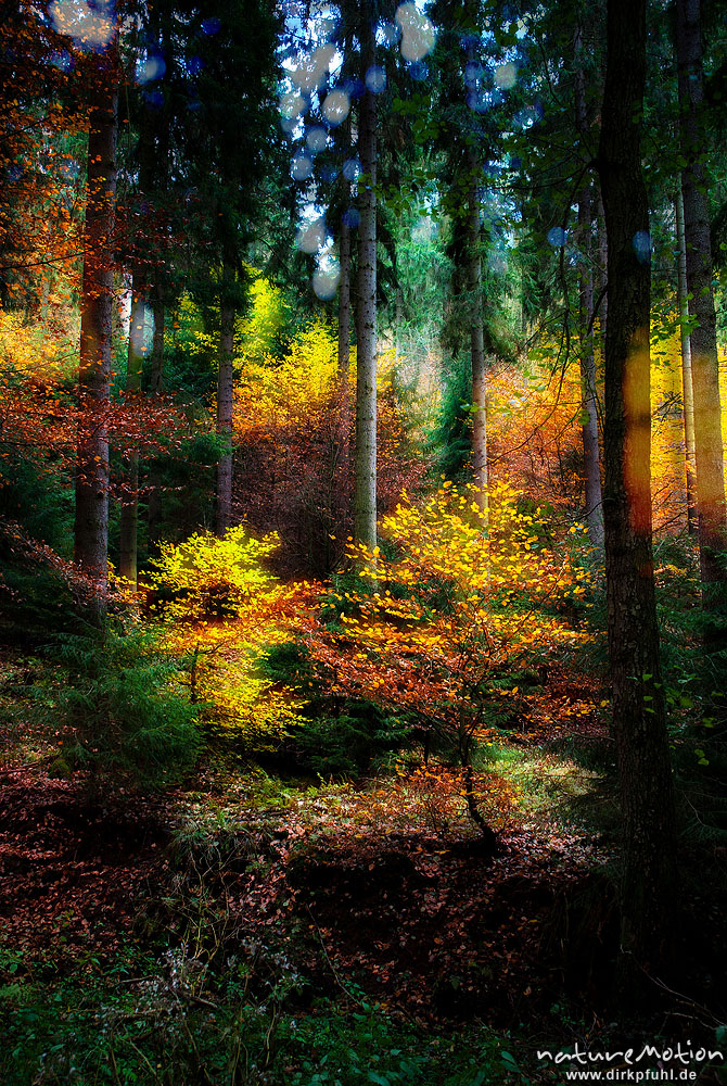Herbstlaub, bunt gefärbte junge Buchen im Fichtenforst, Dop ...