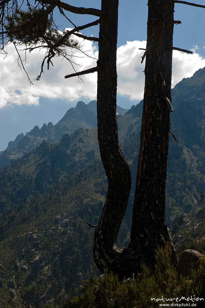 Kiefer mit gegabeltem Stamm, Restonica-Tal, Korsika, Frankre ...