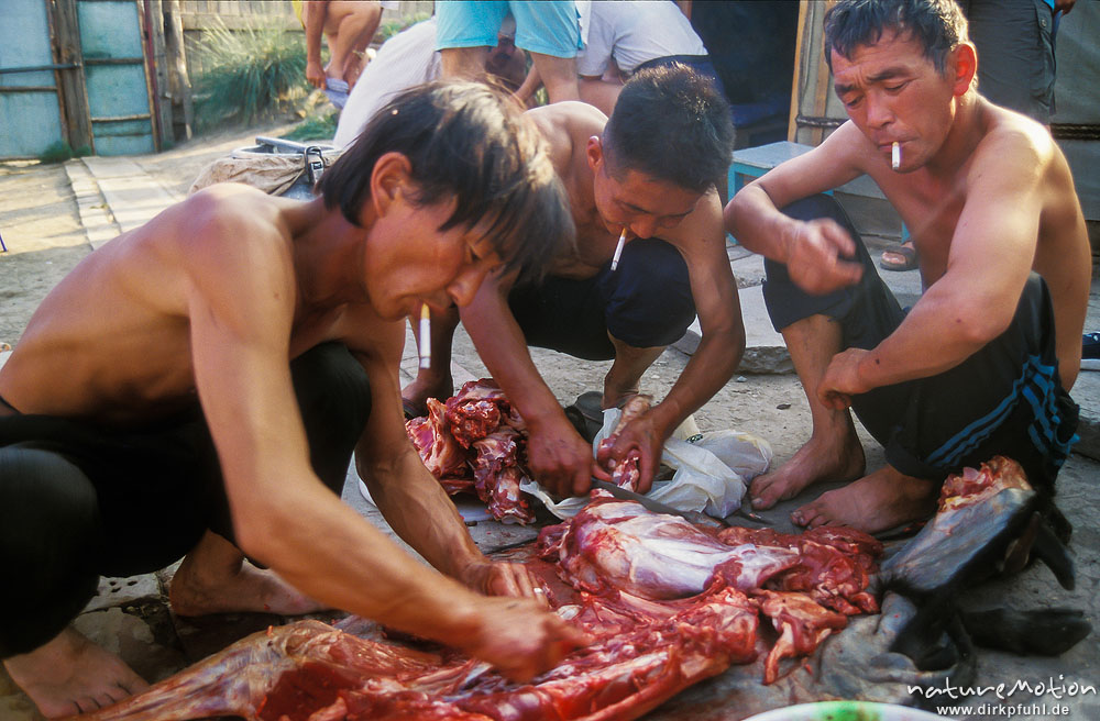 drei Männer beim Schlachten, jeder mit Zigarette, Ganas Gue ...