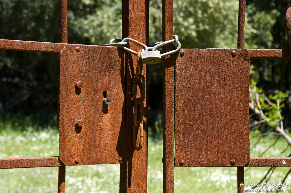 Kette mit Vorhängeschloss, schmiedeeisernes Tor, Restonica- ...