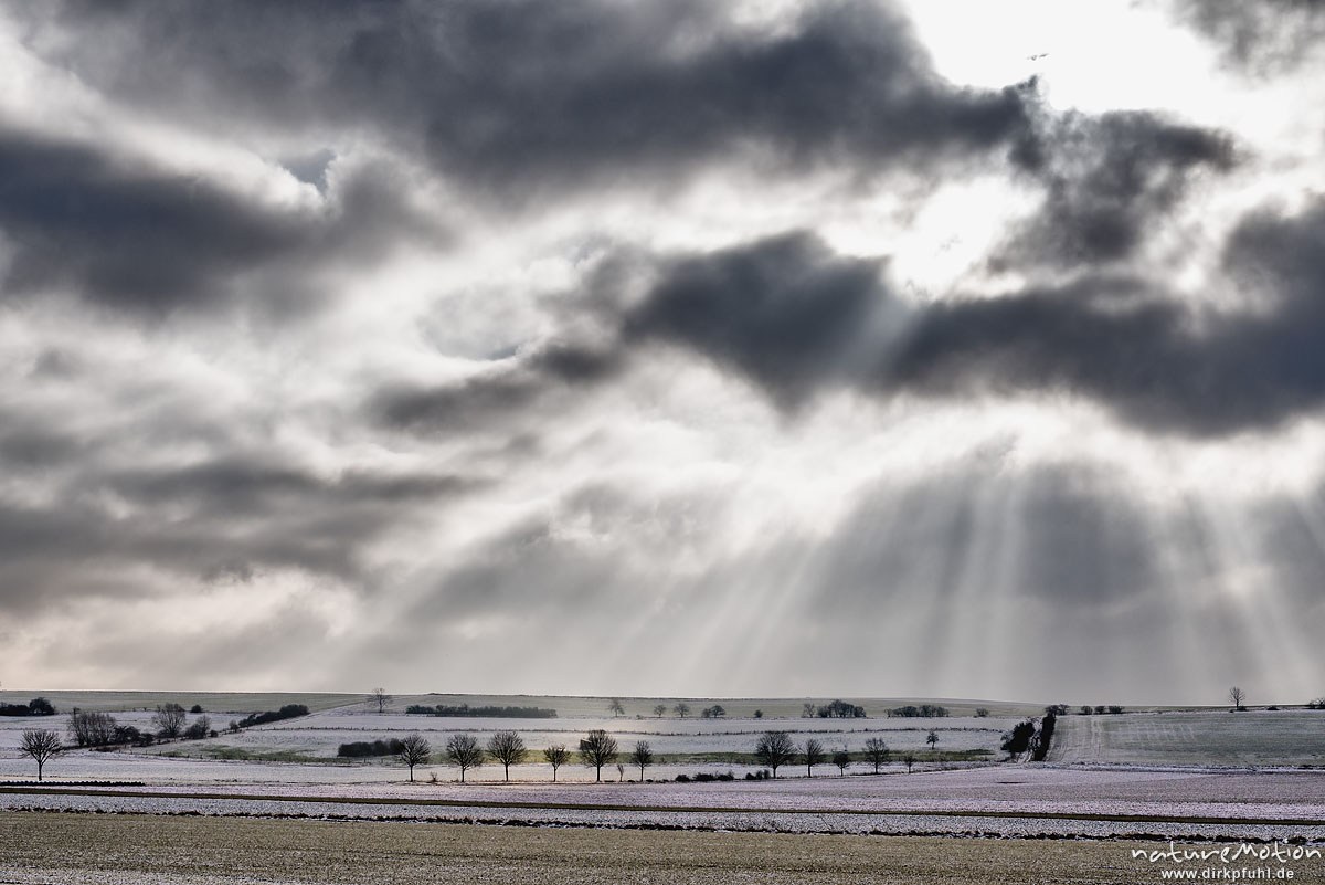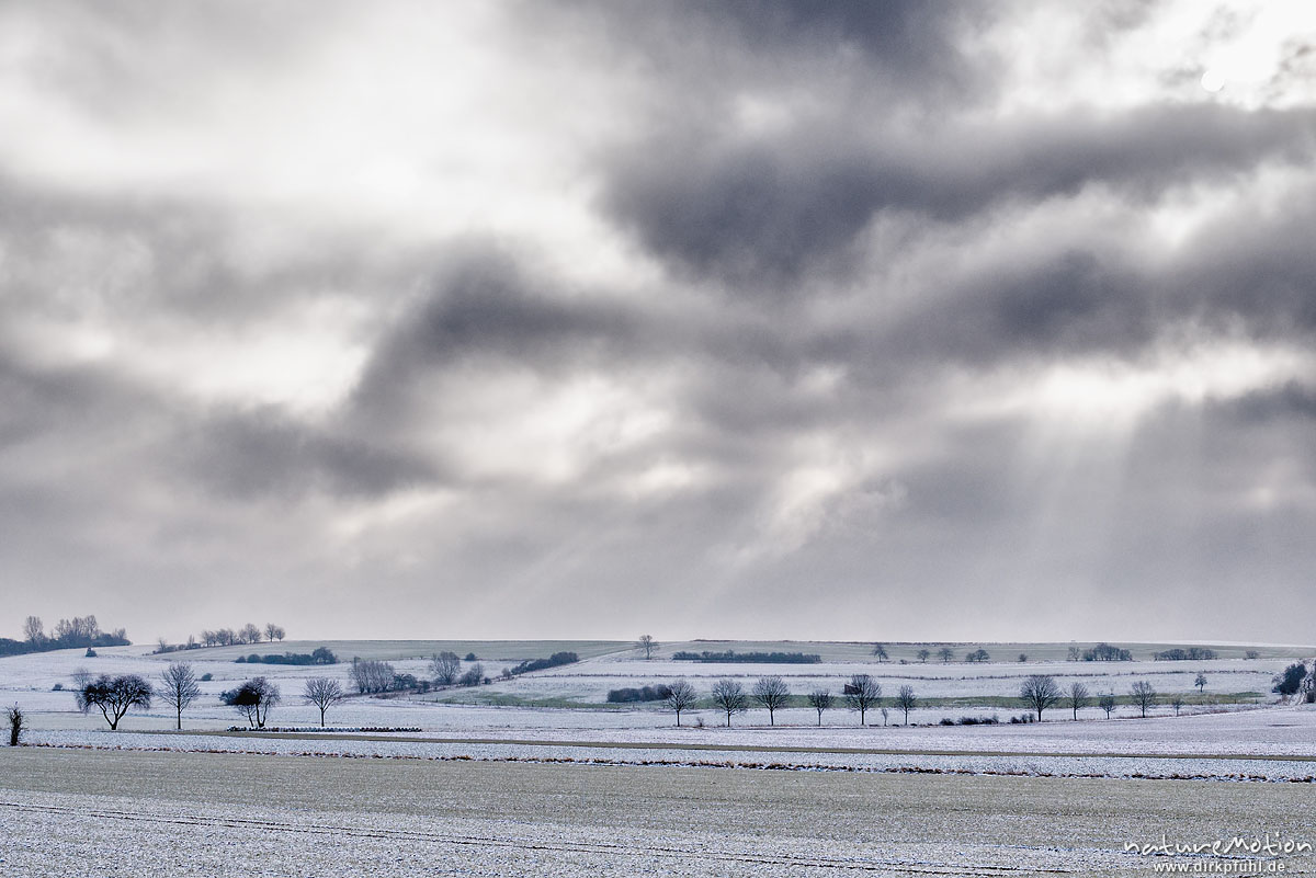 mit Schnee bedeckte Felder und Baumreihen, Lichtstrahlen, Di ...