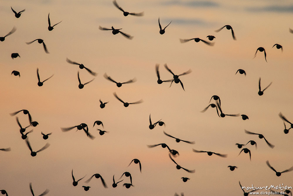 Star, Sturnus vulgaris, Sturnidae, Schwarm beim abendlichen ...