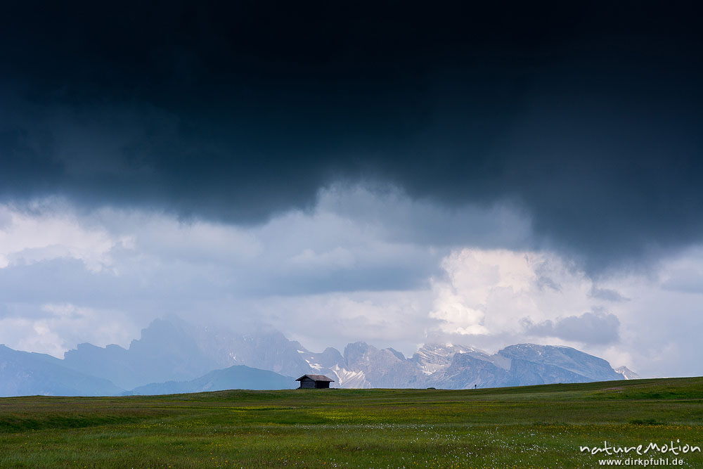 Gewitterwolken, Hütten und Almwiesen, Geisslergruppe, Seise ...