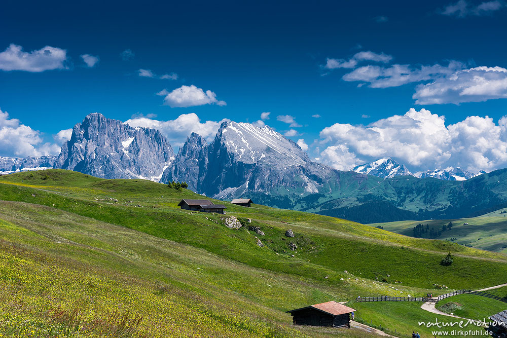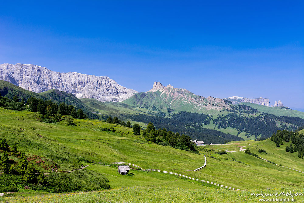Langkofel, Plattkofel, Almwiesen und Hütten, Wanderweg zwis ...