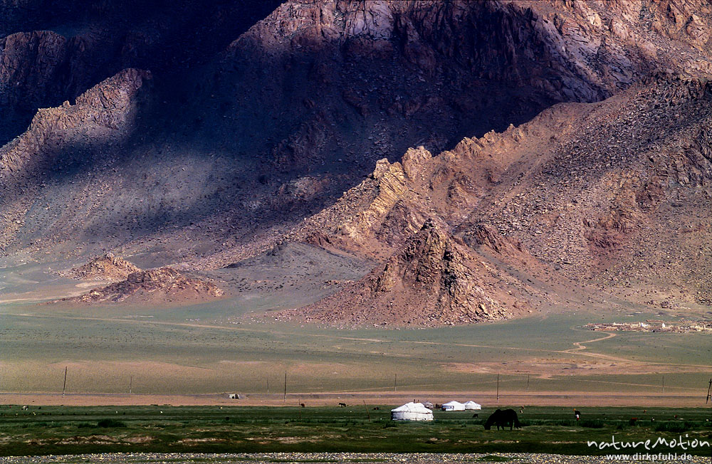 Jurten vor scharf gezackten Höhenzügen, Chowd, Mongolei ...