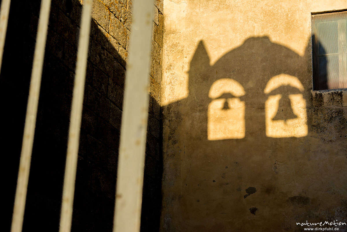 Schatten von Kirchenglocken auf Mauer, San Piero, Elba, Ital ...