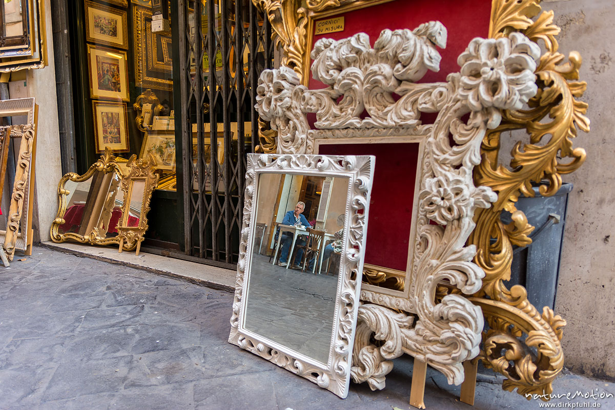 Geschäft mit Bilderrahmen und Spiegeln, Mann am Tisch spieg ...