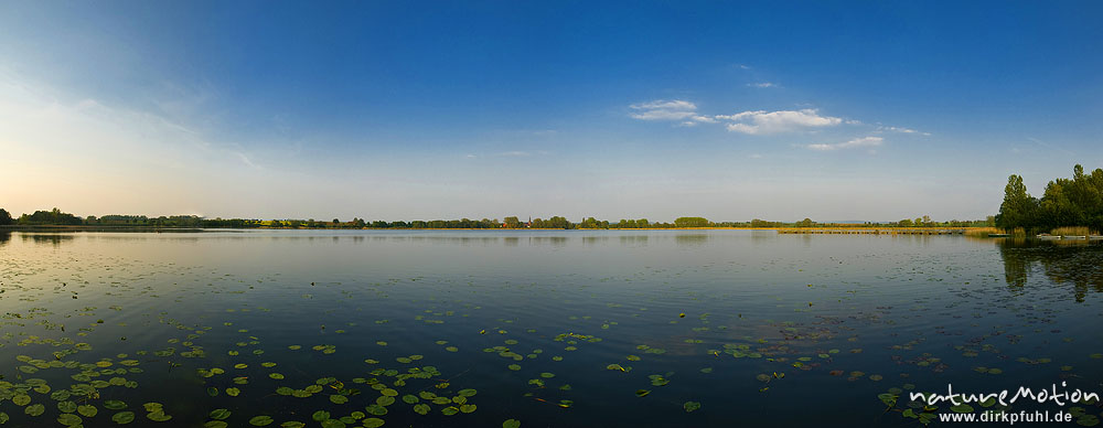 See mit Seerosenblättern und Schilfgürtel, Häuser und Kir ...